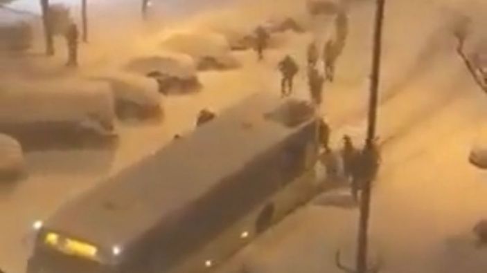 Yoğun kar yağışı nedeniyle ulaşımın aksadığı İstanbul'da yolda kalan belediye otobüsünü iten yolcular, ardından çalışan aracın peşinden koşturdu.