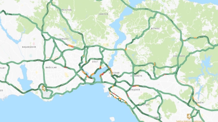 İBB’nin trafik haritasına göre, yoğunluk yüzde 18 olarak ölçüldü. Haritanın neredeyse tamamının yeşile döndüğü görüldü.