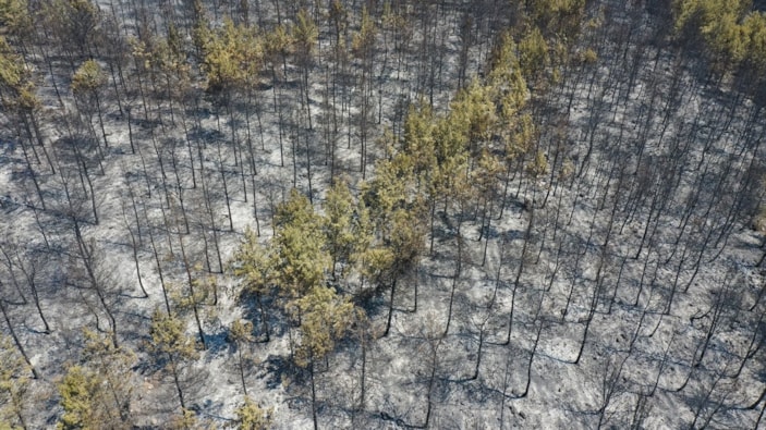 Dün öğle saatlerinde iki ilçede başlayan orman yangınları saatler sonra kontrol altına alındı. Menderes'te yanan ormanlardan geriye siyah bir görüntü kaldı.