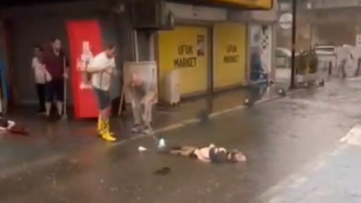 Konak'ta sokaktaki su birikintisini geçerken elektrik akımına kapılarak can veren İnanç Öktemay ve Özge Ceren Deniz'in çevredekilerin çabasıyla su birikintisinden çıkartılma anları sosyal medyanın gündeminde.