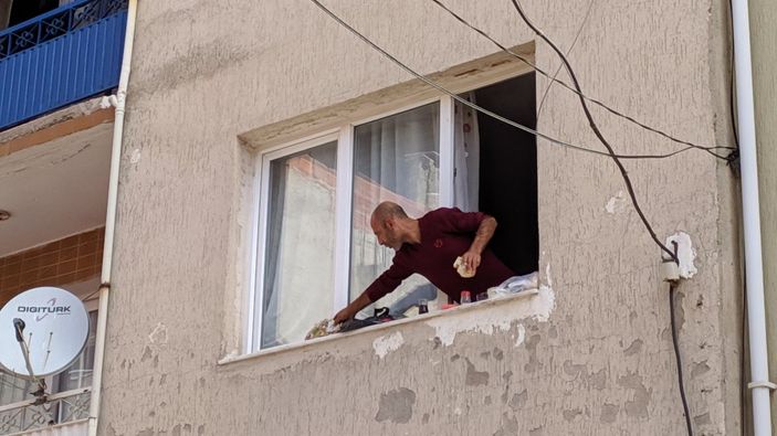 İzmir'de eşyaları sokağa atıp pencere kenarında kahvaltı yaptı