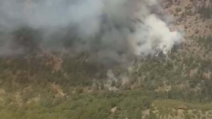 Yangının çıkış nedeni araştırılırken, sarp arazideki alevlere havadan ve karadan müdahale sürüyor.