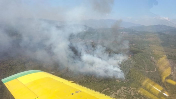 İhbar üzerine bölgeye, İzmir Orman Bölge Müdürlüğüne bağlı 6 uçak, 8 helikopter, 25 arazöz, 7 su ikmal aracı ile 5 dozer sevk edildi.