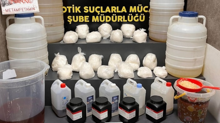 Savcılıktan alınan izinle belirlenen adrese operasyon gerçekleştiren ekipler, kristal ve sıvı halde olmak üzere toplam 112 kilo 300 gram metamfetamin maddesi ele geçirdi.