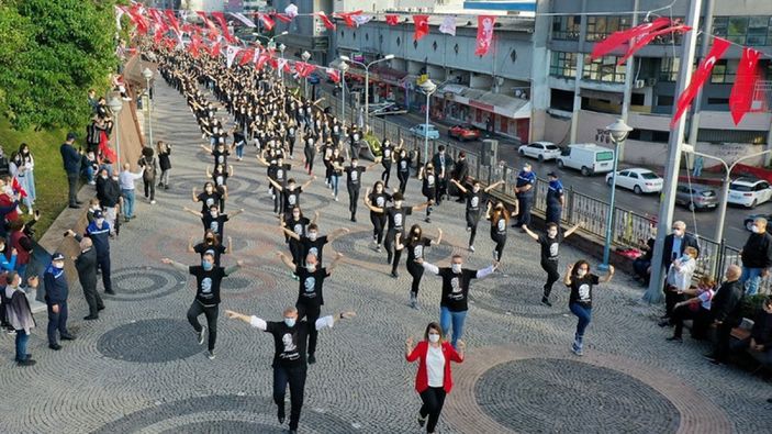 Kocaeli’nin İzmit ilçesinde Cumhuriyet’in 97. yıl dönümü coşkusu, bin kişilik zeybek ekibinin sosyal mesafeli zeybek oynamasıyla yaşandı.