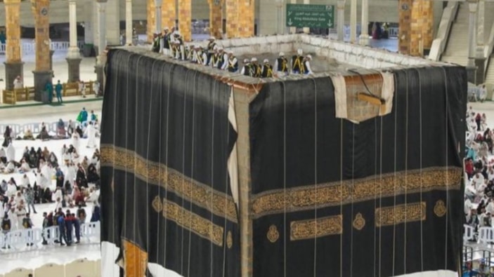 Haremeyn İşleri Genel Başkanlığı tarafından her yıl yapıldığı gibi Kabe'nin eski örtüsü çıkarılarak yerine yenisi yerleştirildi.