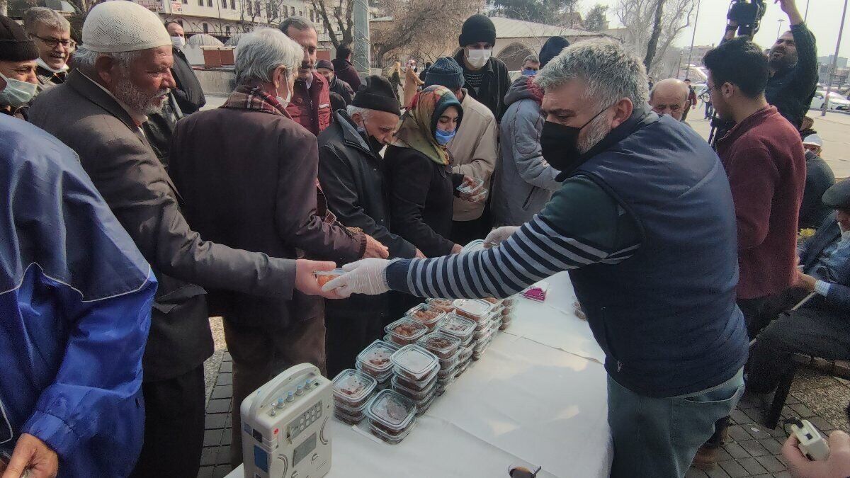 Altun, Cumhurbaşkanı Erdoğan ve eşi için Ulu Cami civarında 100 kilo lokma dağıttı.