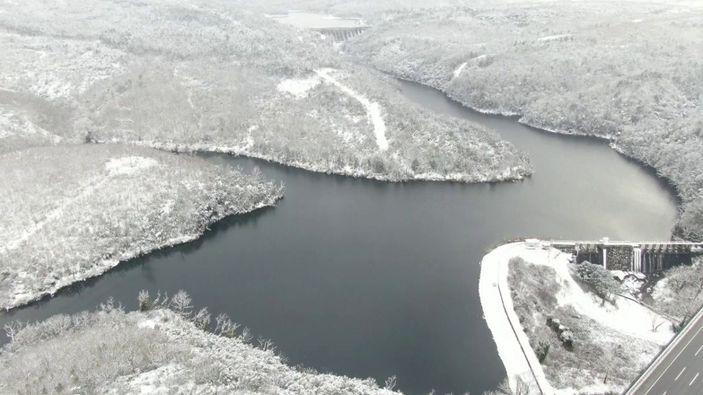 Kar yağışının etkisi ile İstanbul barajlarında doluluk oranı yüzde 54,11’e yükseldi. Kartpostallık görüntülerin oluştuğu Elmalı Barajı, havadan görüntülendi.