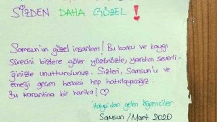Mahmutoğlu'nun kapısına astığı mesajda, "Karantinanın kollarına giderken memleketinize, kalplerimiz pırpır atarken ürkek ve endişeli, korkunun balyoz gibi başımızda gezdiği endişeli günler ve saatler...Meğer küçükmüş korku dağlarımız, meğer sıcak ve sevgi doluymuş Samsun. Meğer kocaman kalpli insanların ülkesiymiş. Teşekkürler minnettarız. Sizlere çok borçlandık, hiçbir şeyle ödeyemeyeceğimiz kadar borçlandık. İzin verirseniz hepinizin ellerinden öperiz." ifadeleri yer alıyor.