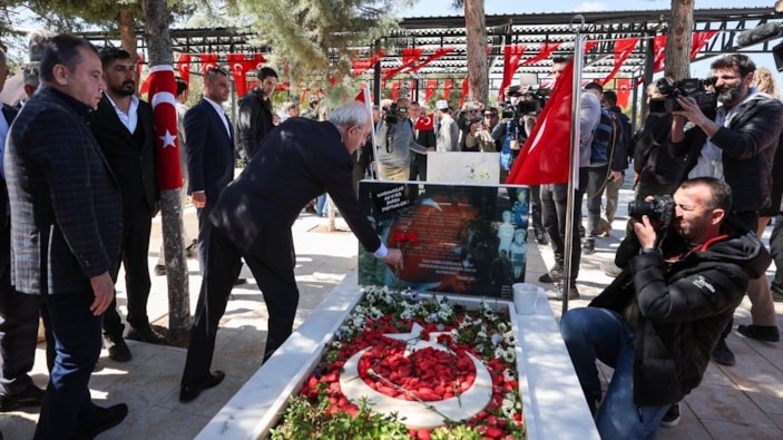 2017 yılında henüz 23 yaşındayken Siirt'te terör örgütü PKK'nın hain saldırısında şehit olan uzman onbaşı Ferhat Gözen'in kabrine karanfil bırakan Kılıçdaroğlu, dua etti.