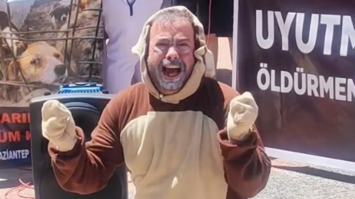 Başıboş köpeklerinin sokaklardan temizlenmesine yönelik düzenlemeye karşı protesto gösterisi düzenlenen Kilis'te bir hayvansever, kostüm giyerek bir sokak köpeğini canlandırdı.