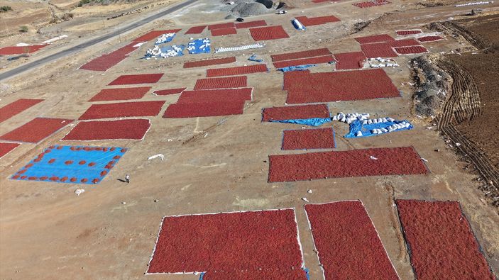 Yoğun emek isteyen süreçte çiftçiler sabahın ilk saatlerinde çalışmaya başlarken, kurutma alanları kırmızıya bürünüyor.