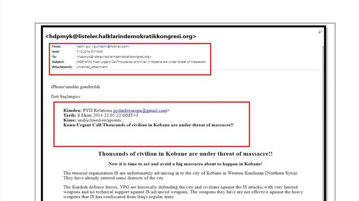 Buna ilişkin emniyetin hazırladığı ve davanın ek klasörlerinde yer alan raporda, söz konusu e-postanın, "6 Ekim 2014 saat 22.05"te, "pydinfoeuropa@gmail.com" adresinden davanın tutuklu sanığı eski HDP MYK Üyesi Nazmi Gür'e, ondan da dönemin HDP MYK üyelerinin yer aldığı "hdpmyk@listeler.halklarindemokratikkongresi.org" adresine gönderildiği tespit edildiği belirtildi.