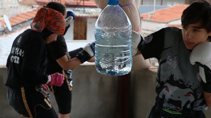 Koronavirüs sürecinde Muay Thai sporcusu Ömer Faruk, Şerife Naz ve Muhammet Öksüz kardeşler, evlerinin çatısında içi su dolu pet şişe ve yastıklarla antrenmanlarını sürdürüyorlar.