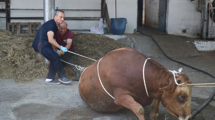 Bizim yatırdığımız hayvan 500 kilogramlık bir hayvan yani iki kişi çok rahatlıkla, hiçbir zarar vermeden yatırabilir. İki kişinin bu ağırlıkta bir hayvanı yatırması normal şartlarda mümkün değil. Bunu yaparken öncelikle sağlam bir ağaca ya da uygun bir yere bağlamamız gerekiyor. Sağlam bir iple önce boynuzlarını sonra boynundan hareketli bir düğüm oluşturarak göğse daha sonrasında kasıklara olacak şekilde hareketli düğüm yapılıyor.