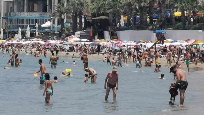 Kuşadası’nın dünyaca ünlü plajı pazar günü yasakların kalkmasıyla birlikte doldu taştı, bazı otellerin havuzları yoğunluk yaşanırken, su parklarına ilgi yoğun oldu.