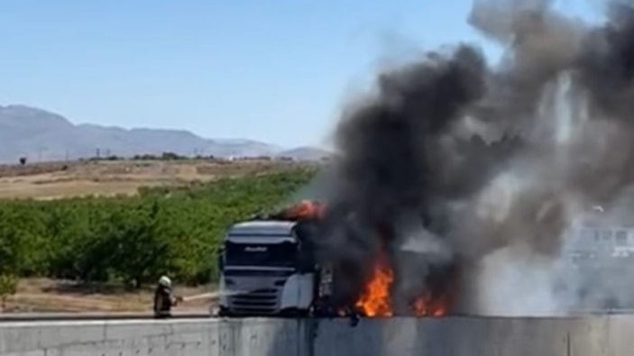 Malatya’da lastiği patlayan tır bariyerlere çarpıp alev aldı