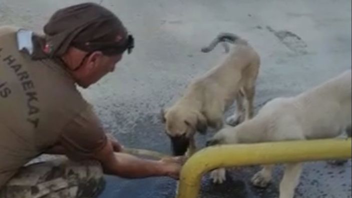 Polis memuru, susayan 2 yavru sokak köpeğine elleriyle su içirdi.