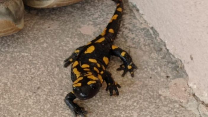 İnternette araştırdığında sürüngenin sarı benekli Anadolu semenderi olduğunu öğrenen Adak, nesli tehdit altında olan semenderi yetkililere teslim edeceğini söyledi.