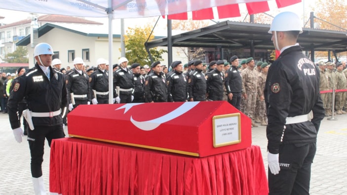 Şehit polisin Türk bayrağına sarılı naaşı, Malatya Şehir Mezarlığı'ndaki işlemlerinin ardından İl Emniyet Müdürlüğü bahçesine getirilerek katafalka konuldu.
