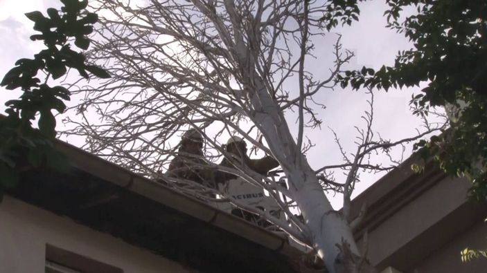Çatıya yaslanarak duran ağacı görenler durumu itfaiyeye bildirdi. Olay yerine gelen ekipler, çatıya çıkarak ağacı en tepesinden testereyle kesmeye başladı. Dallarının kesilmesinin ardından ağaç devrildiği yerden alındı.