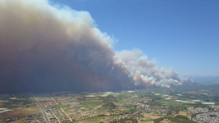Helikopterden ve yangın söndürme uçağından çekilen görüntülerde, alevlerin büyük bir alana yayıldığı, dumanın gökyüzünü kapladığı görüldü.
