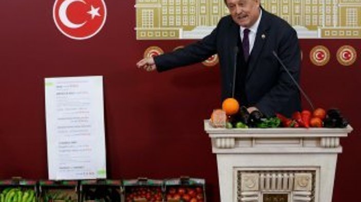 CHP Antalya Milletvekili Aydın Özer, sebze ve meyve fiyatlarındaki artışa dikkat çekmek için Meclis'te basın toplantısı düzenledi. Özer toplantıda, kasa kasa sebzeyle kameralar karşısına çıktı.