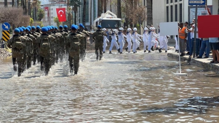 Bulvarda törenin son kısımlarında suyun yeniden yükselmesi nedeniyle öğrenciler ve askerler su içinde yürüdü.