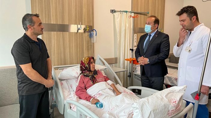 Yaralı afetzedelerle görüşüp "geçmiş olsun" dileklerini ileten Pehlivan, Başhekim Opr. Dr. Sadık Emre Direk'ten tedavi süreçlerine ilişkin bilgi aldı.