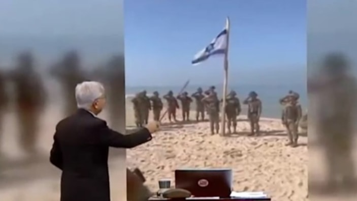Görüntülerde İsrailli askerler, bir direğe geçirilmiş İsrail bayrağı etrafında israil marşını söylüyor.