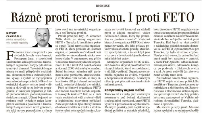 Çekya'nın saygın siyaset ve politika gazetesi Lidove Noviny de darbe girişiminin 5. yılında Dışişleri Bakanı Mevlüt Çavuşoğlu'nun, “Neden FETÖ'yle kararlılıkla mücadele etmeliyiz” başlıklı makalesine yer verdi.