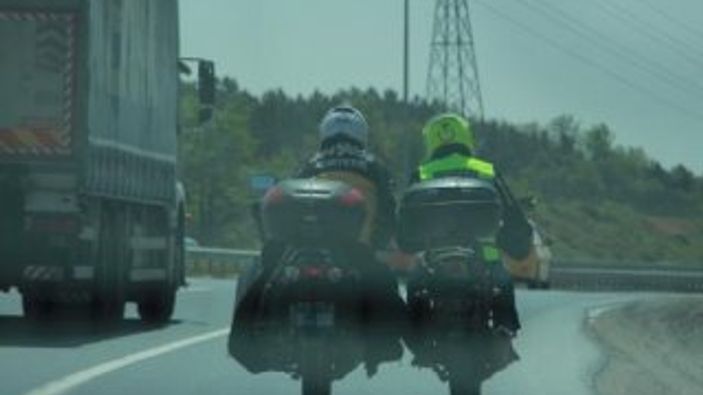 Emniyet şeridinden ilerleyen motosikletliler, kamyonların arasında adeta tehlikeye davetiye çıkardı. Bir süre yan yana ilerleyen motosikletliler, daha sonra gözden kayboldu.