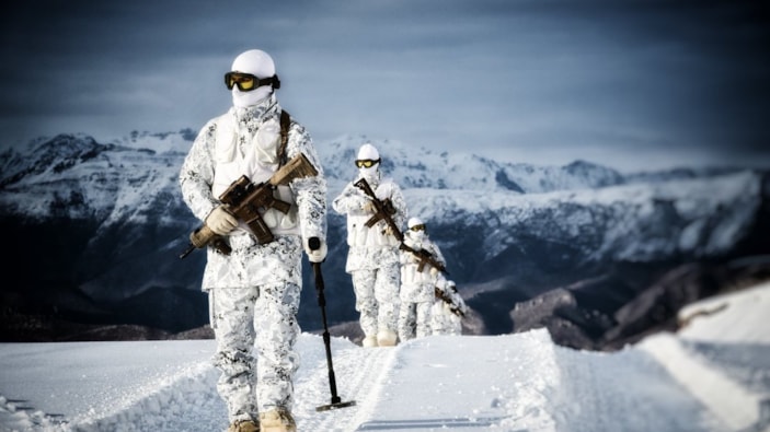 Vatan savunmasında zorlu koşullara da göğüs geren Mehmetçik, öyle ki karlı dağlarda, sırtlarında yükleriyle gözlerini bile kırpmıyorlar.