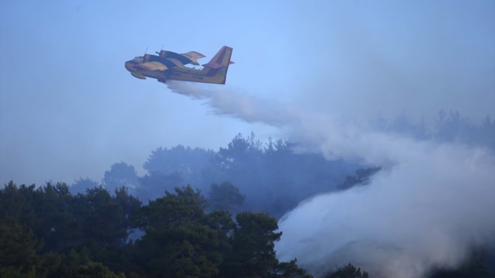 Dalaman'da ormanlık alanda çıkan yangının ihbarı üzerine olay yerine sevk edilen itfaiye ekiplerinin, alevlere havadan ve karadan müdahaleleri sürüyor.