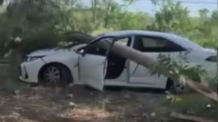 Yoldan geçen diğer araçların güvenlik kameralarına yansıyan kazada, radar aracının devrilen ağacın altında kalma anları net şekilde görüldü.