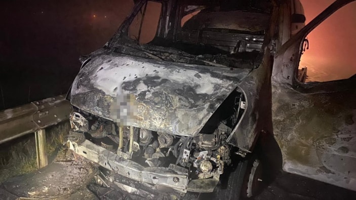 Sürücü yangını yaralanmadan atlatırken yanan çekici ve üstündeki araç, inceleme yapılmak üzere parka çekildi.