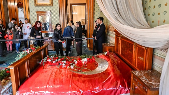 Mustafa Kemal Atatürk'ün 10 Kasım 1938'de yaşamını yitirdiği Türk bayrağı örtülü yatağının iki yanında, iki polis memuru saygı nöbeti tuttu.