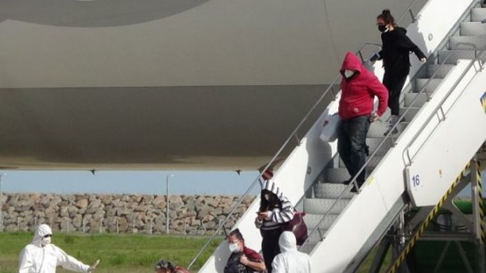 Sağlık kontrolünden geçirilip uçaktan indikten sonra el çantaları ve valizleri dezenfekte edilen vatandaşların, geniş güvenlik önlemleri altında havalimanına girişleri sağlandı.