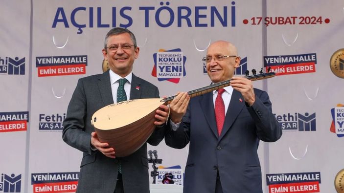 CHP Genel Başkanı Özgür Özel, Ankara'da katıldığı cemevi açılış töreninde, kendisine hediye edilen sazı öperek görevliye teslim etti.