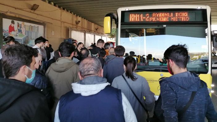 Dün akşam mesai saatlerinde yaşanan kalabalık kameralara yansıdı. KM11-2 Aydınlı TOKİ-Ahmet Yesevi Pendik Metro otobüsünün gelmesini bekleyenler, uzun kuyruk oluşturdu. Otobüs durağa geldikten sonra ise tüm koronavirüs kuralları ihlal edildi.