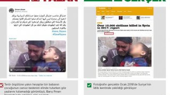Aynı şekilde sosyal medyada harekatı karalamak için çeşitli etiketler kullanan YPG/PKK yandaşları, bir babanın çocuğunun cansız bedenini elinde tutarken göz yaşlarına hakim olamadığı videoyu paylaştı. Aynı görüntünün Ocak 2018'de Suriye'nin İdlib kentinde kaydedildiği anlaşıldı.