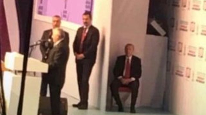 Toplantıda gözlerden kaçan bir detay vardı. Katılımcılar tarafından çekilen fotoğrafta; Cumhurbaşkanı Erdoğan, Binali Yıldırım konuşurken yanında durmamış ve sahne arkasında kendisine getirilen sandalyeye oturarak konuşmayı takip etmişti.