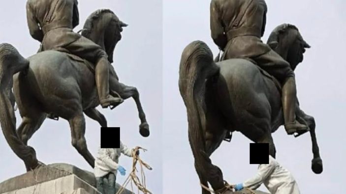 HEYKELE HALAT BAĞLAYIP ARAÇLA ÇEKMEYE ÇALIŞTILAR
