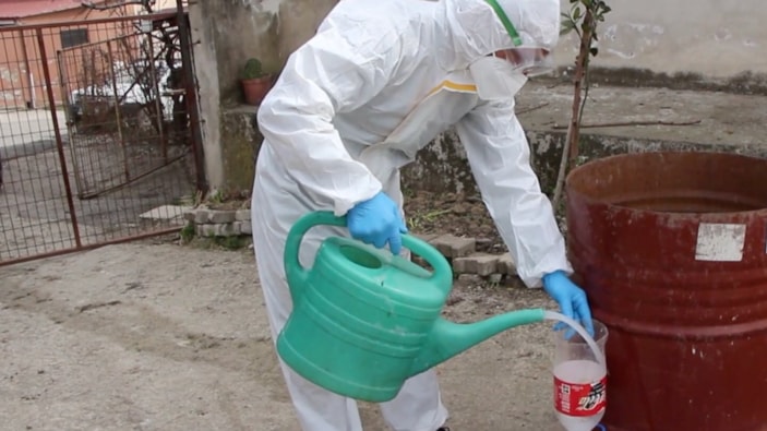 Tarım İl Müdürlüğü bize ilaçlar, maskeler dağıttı. Biz de bu ilaçları muhtarlık olarak 5 kiloluk bidonlara hazırlayıp vatandaşa veriyoruz. Nasıl kullanacaklarını aktarıp tarif ediyoruz.