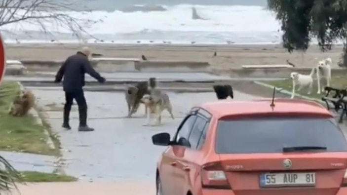 Kent merkezinde sahil kesimini mesken tutan sokak köpekleri, yolu kullananların kabusu oldu. Köpeklerin son olarak yoldan geçen bir vatandaşa saldırmaları kameralara yansıdı.