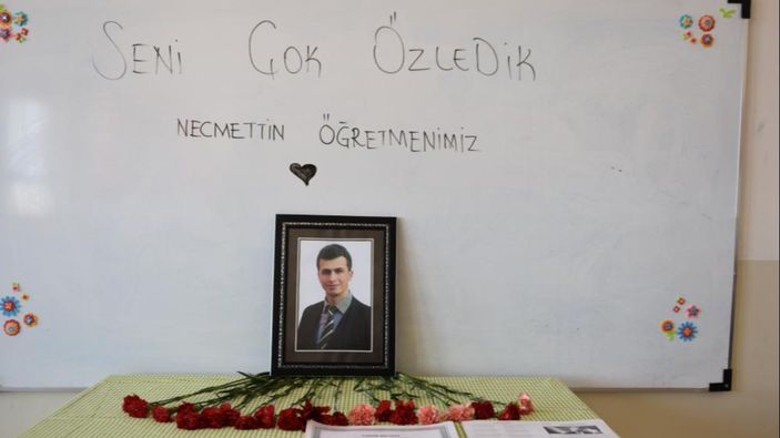 Şehit Necmettin Yılmaz’ın isminin verildiği okulda yapılan karne töreni hüzünlü anlara sahne olurken, öğretmen ve öğrenciler Necmettin Öğretmen'i andı.