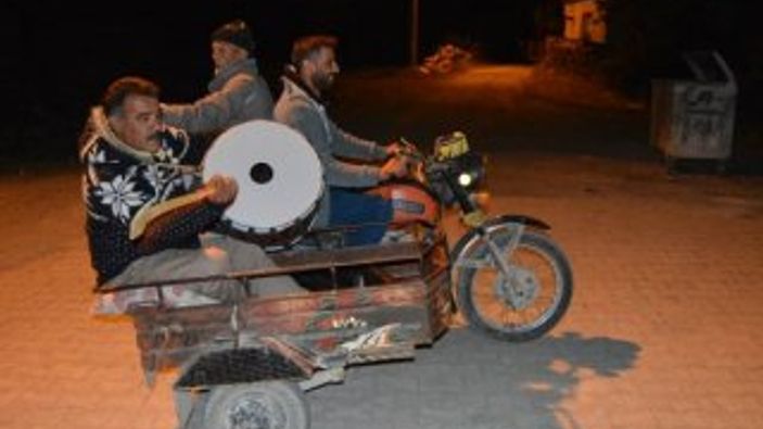 Ramazan davulcusu üç kişiden biri motosikleti kullanırken, diğeri arkasına ters ve üçüncüsü ise sepete oturarak davul çalıyor. Gazetecilere açıklama yapan Gökhan Çalar, bölge geniş olduğu için sepetli motosiklet kullanarak daha kısa sürede, daha fazla insana ulaştıklarını söyledi.