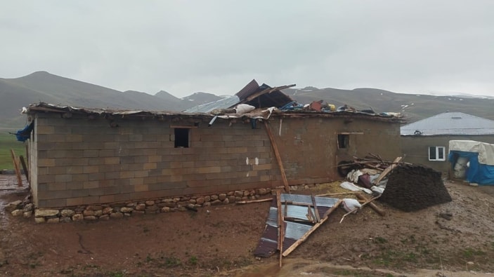 Yüksek rakımlı bölgelerde etkili olan fırtına, Ferhan Yacan’a ait ev ve ağılın çatısı uçurdu.