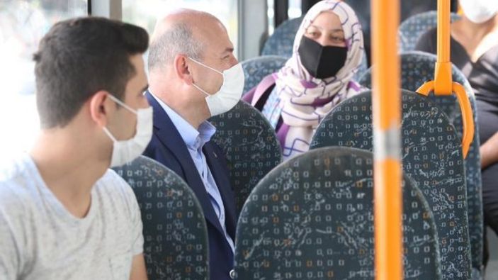 Otobüsteki koronavirüs tedbirlerini inceleyen ve yolcularla sohbet eden Soylu, “Eğer kurallara uymazsak sonuç iyi olmaz.” dedi.