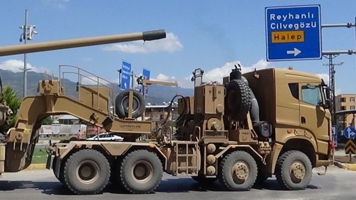 Birliklerden gönderilen askeri personelleri taşıyan otobüsler ve tırlara yüklenmiş obüsler, geniş güvenlik önlemleri altında Kırıkhan ilçesinden geçerek Hatay'daki sınır birliklerine doğru devam etti.